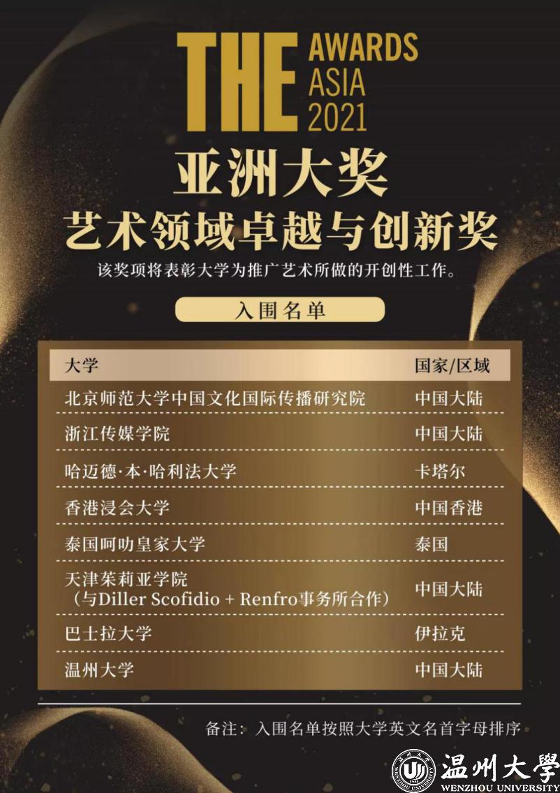 Our University Has Been Shortlisted for the 2021 Times Higher Education Asia Award: Excellence and Innovation Award for Arts On 14 December, the Times Higher Education held a grand online award ceremony, which unveiled the 2021 Times Higher Education Asia Award. Our university stood out from more than 500 universities around the world and was successfully shortlisted for the Excellence and Innovation Award for Arts.There are ten categories for this year’s Asia Awards, which are Excellence and Innovation Award for Ar...
