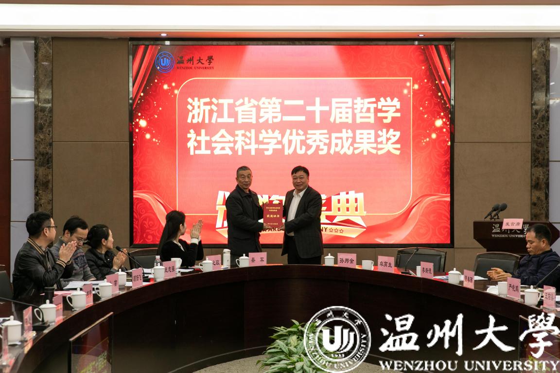 徐和昆宣读获得浙江省第二十届哲学社会科学优秀成果奖的我校获奖名单。赵敏校长为每位获奖者颁奖并合影留念。浙江省哲学社会科学优秀成果奖是省政府颁发的我省哲学社会科学研究最高奖项,是检阅、展示我省哲学社会科学发展成果的重要平台。在本届成果奖的评审中,我校马大康教授获得一等奖,王小盾教授、刘玉侠教授和胡振华教授获得二等奖,王皓、邱志诚、夏雨禾、夏怡然等四位老师获得三等奖,奖项总数全省排名第8。