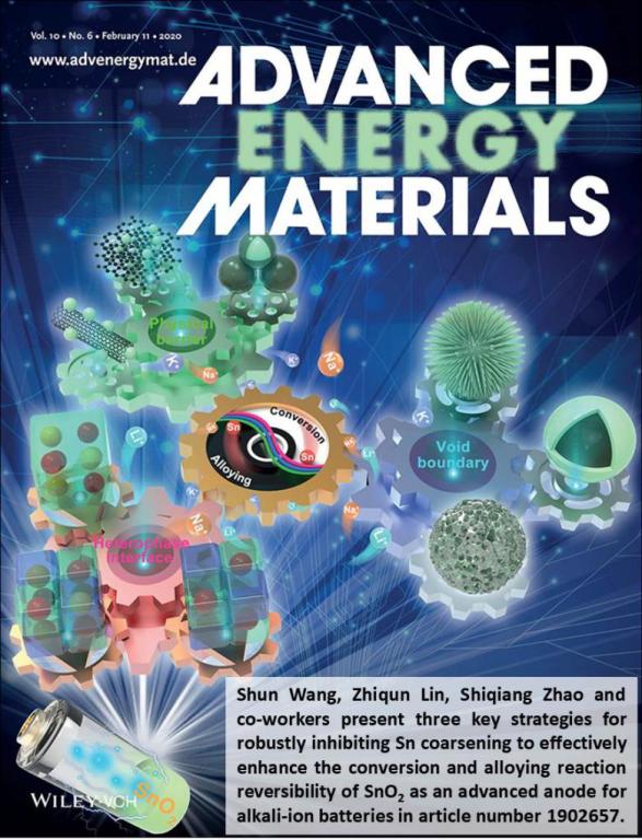 近日,国际能源顶级刊物《Advanced Energy Materials》将有关二氧化锡作为碱金属离子电池负极的综述论文“SnO2as Advanced Anode of Alkali-Ion Batteries: Inhibiting Sn Coarsening by Crafting Robust Physical Barriers, Void Boundaries, and Heterophase Interfaces for Superior Electrochemical Reaction Reversibility”选为期刊封面文章。该文章第一作者为赵世强博士,化材学院院长王舜教授与佐治亚理工学院林志群教授为通讯作者,星空平台为第一通讯单位。