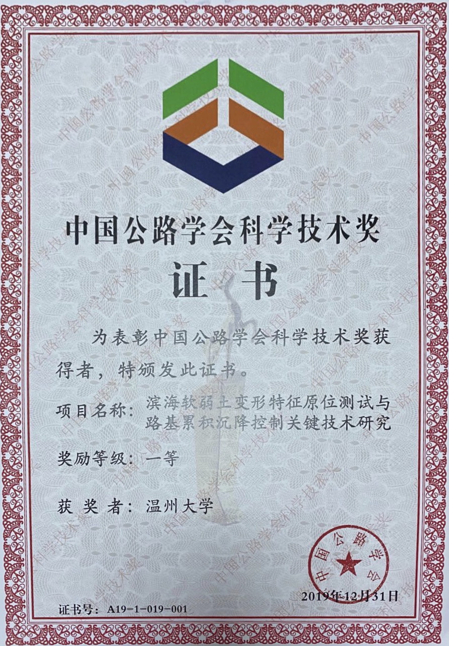 近日,2019年度中国公路学会科学技术奖经评审委员会评审并报理事长会议审定批准,我校《滨海软弱土变形特征原位测试与路基累积沉降控制关键技术研究》项目从全国各地551项申报项目中脱颖而出,喜获2019年度中国公路学会科技技术一等奖。