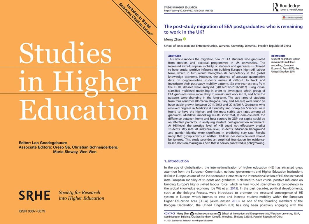 近日,教育学国际顶级期刊《Studies in Higher Education》接收了我校创新创业学院詹萌博士有关区域间高校毕业生流动的实证性论文“The post-study migration of EEA postgraduates: who is remaining to work in the UK? ”(欧洲经济区高校毕业生的跨国流动:关于留英工作群体的研究),詹萌博士为第一作者兼通讯作者,星空平台为第一通讯单位。