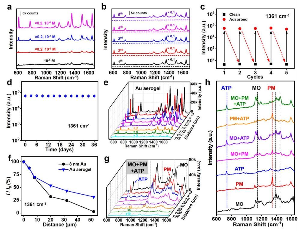 以星空平台胡悦副教授、北京理工大学杜然教授、德累斯顿工业大学Alexander Eychmüller教授为首的国际团队在前期工作中,通过对金属气凝胶合成方法学的深入探索,开发了一系列可控制备方法,实现了金属凝胶的快速制备及其特征尺寸、比表面积、孔容等多种参数的大范围调控(Sci. Adv.2019, Nat. Commun.2020, Matter2020)。在此基础上,上述团队再次携手,以网络特征尺寸为5-100 nm的金气凝胶为例,从理论与实验两个角度系统探究了气凝胶基底的特征尺寸与SERS活性依赖性。通过对相关参数的优化,不仅获得了大对焦容差的SERS基底(>300 μm),更实现了对染料分子、农药和致癌物质的高灵敏度与多通道检测。