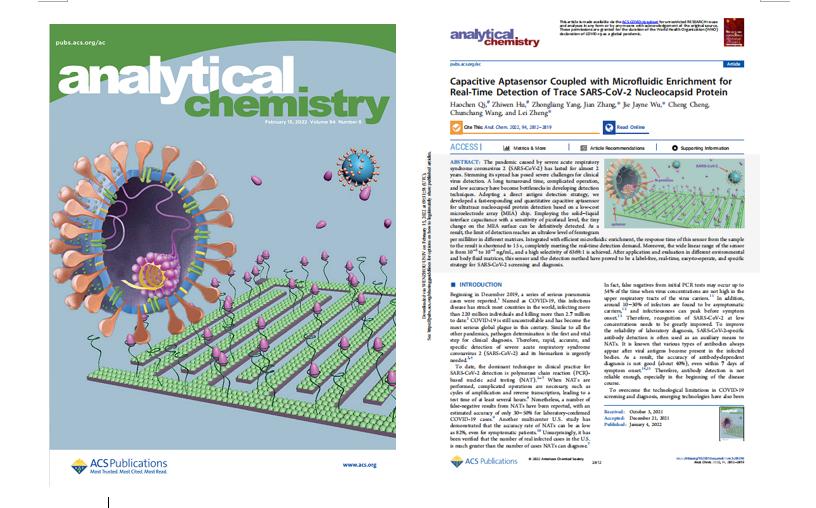近日,我校电气与电子工程学院张鉴教授课题组以“Capacitive Aptasensor Coupled with Microfluidic Enrichment for Real-Time Detection of Trace SARS-CoV‑2 Nucleocapsid Protein”为题在《Analytical Chemistry》发表研究论文,并被期刊选为supplementary cover亮点报道。