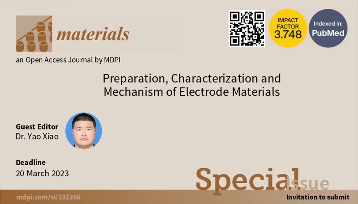 近日,我校化材学院碳中和技术创新研究院肖遥博士受邀担任国际期刊《Materials》(《材料》)的专刊“Preparation, Characterization and Mechanism of Electrode Materials”(电极材料的制备、表征及机理)的Guest Editor(客座主编)。该专刊将发表“电极材料的制备、表征及机理”相关领域的研究论文和综述文章,旨在邀请各个领域的专家学者发表高质量、前瞻性的重要著作,为促进各领域科学家之间的合作提供一个独特的高水平论坛。