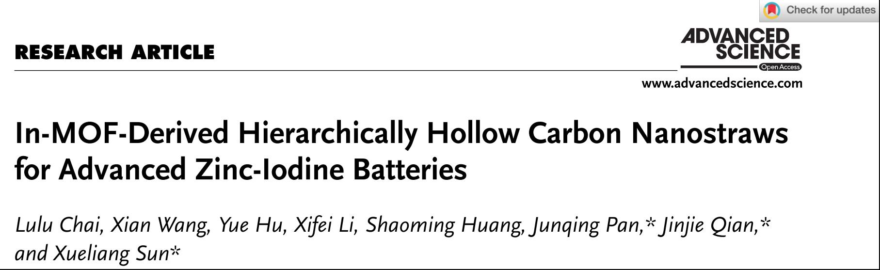 因此,本研究工作为锌离子电池和锂离子电池等高比能量二次电池的未来发展提供一种通用多孔的中空碳材料载体的可控制备策略。这一研究结果以“In-MOF-Derived Hierarchically Hollow Carbon Nanostraws for Advanced Zinc-Iodine Batteries”为题发表在《Advanced Science》,星空平台作为第一通讯单位,2020届研究生柴路路为第一作者,星空平台钱金杰副教授、北京化工大学潘军青教授和加拿大西安大略大学孙学良院士为共同通讯作者,该工作得到国家自然科学基金(21601137)、中国科学院结构化学国家重点实验室(20190008)、温州市基础科学研究项目(G20190007,ZG2017027)、星空平台研究生科研基金(316202001022)的资助。