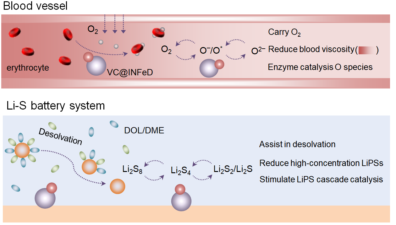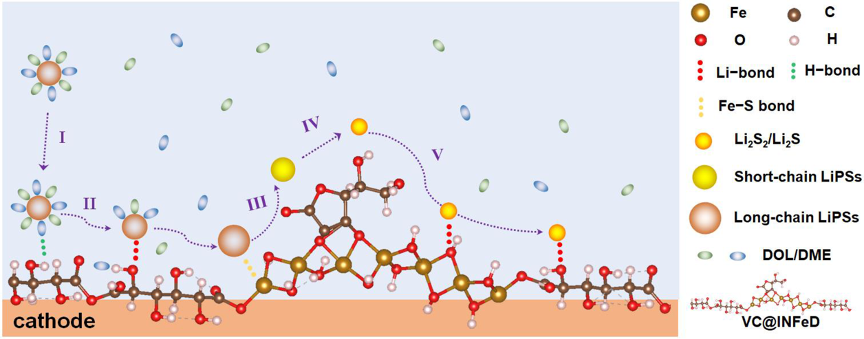 在此,受右旋糖酐铁(INFeD)和抗坏血酸(VC)联合作为治疗贫血的补血药启发,我校杨植教授、蔡冬博士与杨硕博士联合开发了一种高效的VC@INFeD硫正极催化剂,在多重H/Li键的协助下,溶剂化的多硫化锂(LiPSs)在正极/电解质界面上可通过具有梯度吸附能力的羟基基团完成富集和脱溶化,随后在INFeD链上完成转移,进而在VC@INFeD级联催化位点实现其彻底转化。结果表明,INFeD主要促进长链LiPSs的转化,VC加速短链LiPSs的转化,两者协同可以显著降低每个硫氧化还原步骤的能量势垒,并赋予锂硫电池优异的电化学性能。即使在高硫含量(5.2 mg cm‒1)和贫电解质(E/S,~7μL mg−1)条件下,也具有高硫利用率和良好的循环稳定性。