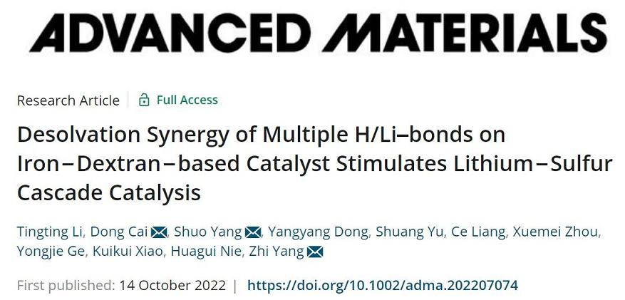 因此,本研究以“Desolvation Synergy of Multiple H/Li–bonds on Iron−Dextran−based Catalyst Stimulates Lithium−Sulfur Cascade Catalysis”为题发表在材料领域顶级期刊《Advanced Materials》。星空平台作为第一通讯单位,2020级研究生李婷婷为第一作者,我校化学与材料工程学院杨植教授、蔡冬博士和电气与电子工程学院杨硕博士为共同通讯作者,我校聂华贵教授、葛勇杰博士、肖逵逵博士、周学梅博士、硕士生梁策、于爽同学以及首届博士生东洋洋同学参与了这项工作。该工作得到国家自然科学基金、浙江省自然科学基金的部分资助。