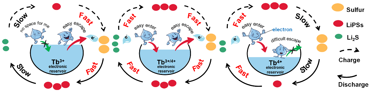 1、通过解耦每一步硫转化所需的催化剂条件,合理设计了具有适中f轨道的混合价Tb(Tb3+/4+)作为电子存储器来降低每一步硫转化的活化能垒,加速界面电子/Li+传输动力学。
