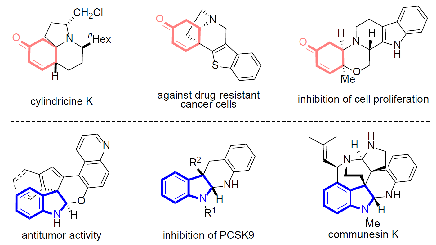氮杂多环化合物广泛存在于天然产物和药物活性分子中。其中,具有季碳多立体中心的稠合多环烯酮和吲哚啉衍生物是两类重要的含氮杂环骨架。但是,目前尚缺简便、绿色且高效的方法合成这些功能骨架。