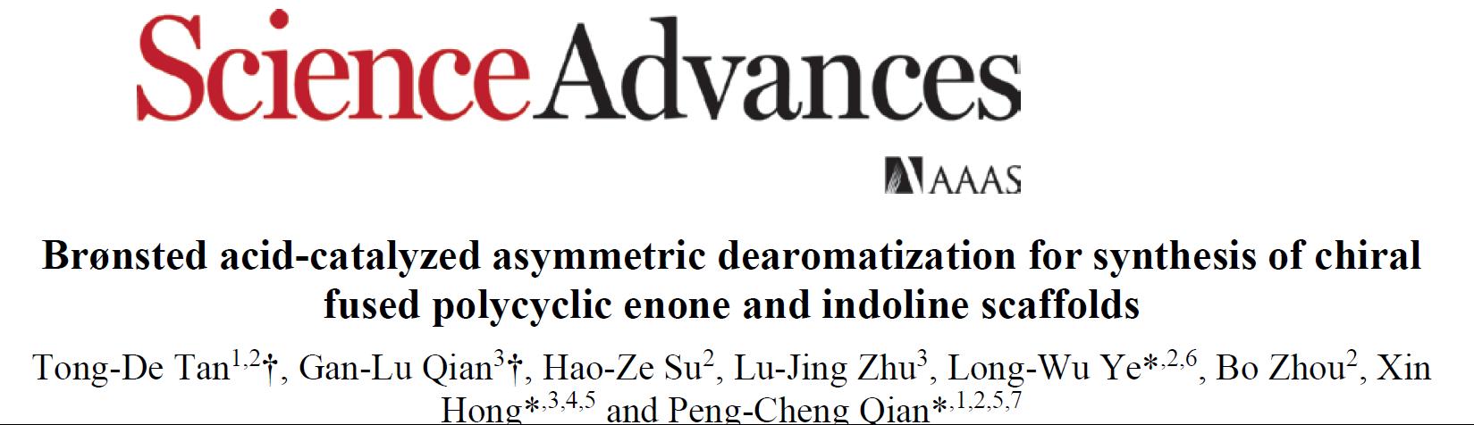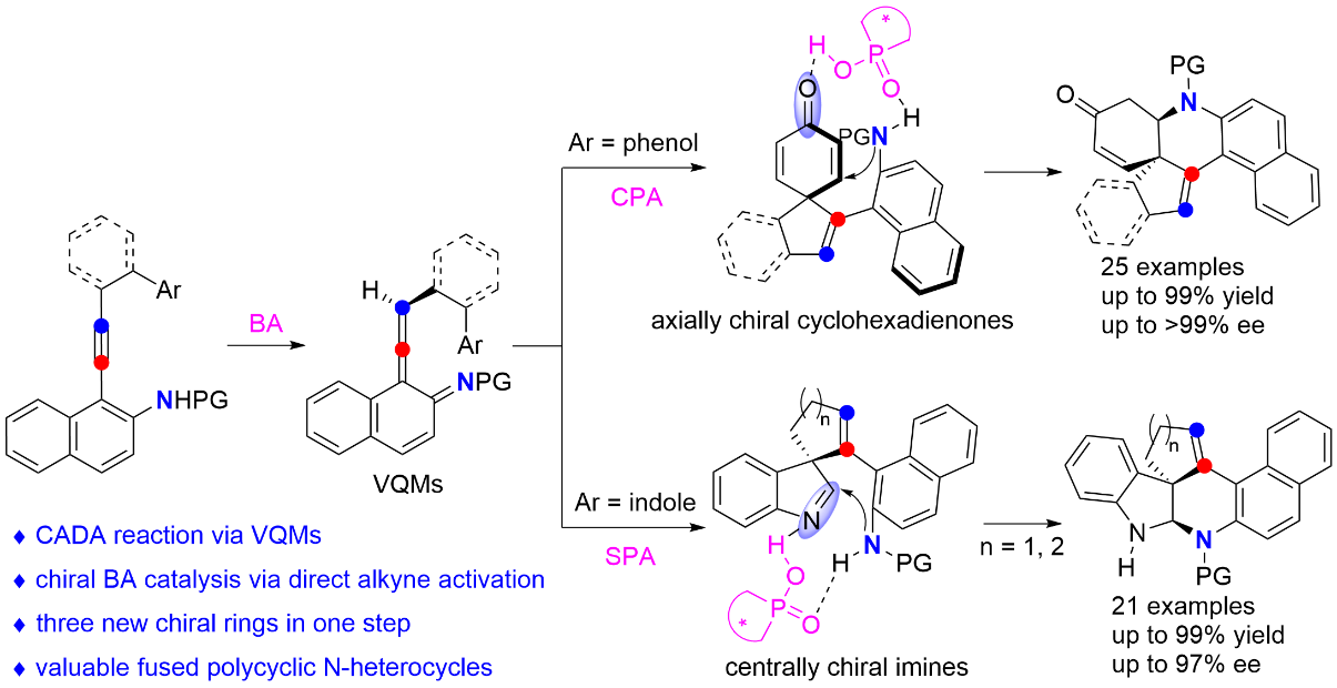 近些年来,通过活化惰性炔烃来实现炔烃催化不对称官能团化反应一直受到人们的广泛关注。与成熟的过渡金属催化这些转化相比,基于惰性炔烃活化的不对称有机催化发展相对较少。近日,我校钱鹏程教授课题组与厦门大学叶龙武教授课题组合作以简单易得的苯酚高炔丙胺和吲哚高炔丙胺为底物,实现了Brønsted酸直接活化炔烃并成功完成苯酚和吲哚催化不对称去芳构化反应。该反应具有如下特点:(1)实现了Brønsted酸直接活化炔烃;(2)报道了无金属参与的基于苯酚和吲哚的不对称去芳构化反应;(3)一步构建具有季碳且多立体中心的含氮杂环;(4)具有优秀的化学选择性、对映选择性和立体选择性。