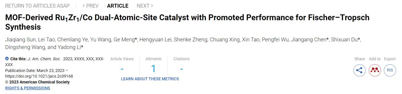 基于DASC的优点和对费托合成研究的不足,我校孟格博士课题组与山西煤化所陈建刚教授、中国科学院大学杜世萱教授以及清华大学李亚栋院士课题组合作合成了Ru1Zr1/Co DASC,该催化剂在200℃下表现出3.8×10-2s-1的高翻转频率(TOF)和80.7%的C5+选择性,这远高于Co、Zr1/Co和Ru1/Co对应的值。密度泛函理论(DFT)计算表明Ru/Zr原子在Co NPs上的界面可以协同作用促进链生长,降低C-O断裂势垒。该工作为高性能费托合成和其他工业催化过程的DASC设计提供了新的机会。这一成果近期发表在Journal of the American Chemical Society(DOI:10.1021/jacs.2c09168)。星空平台化材学院孟格博士为通讯作者之一。