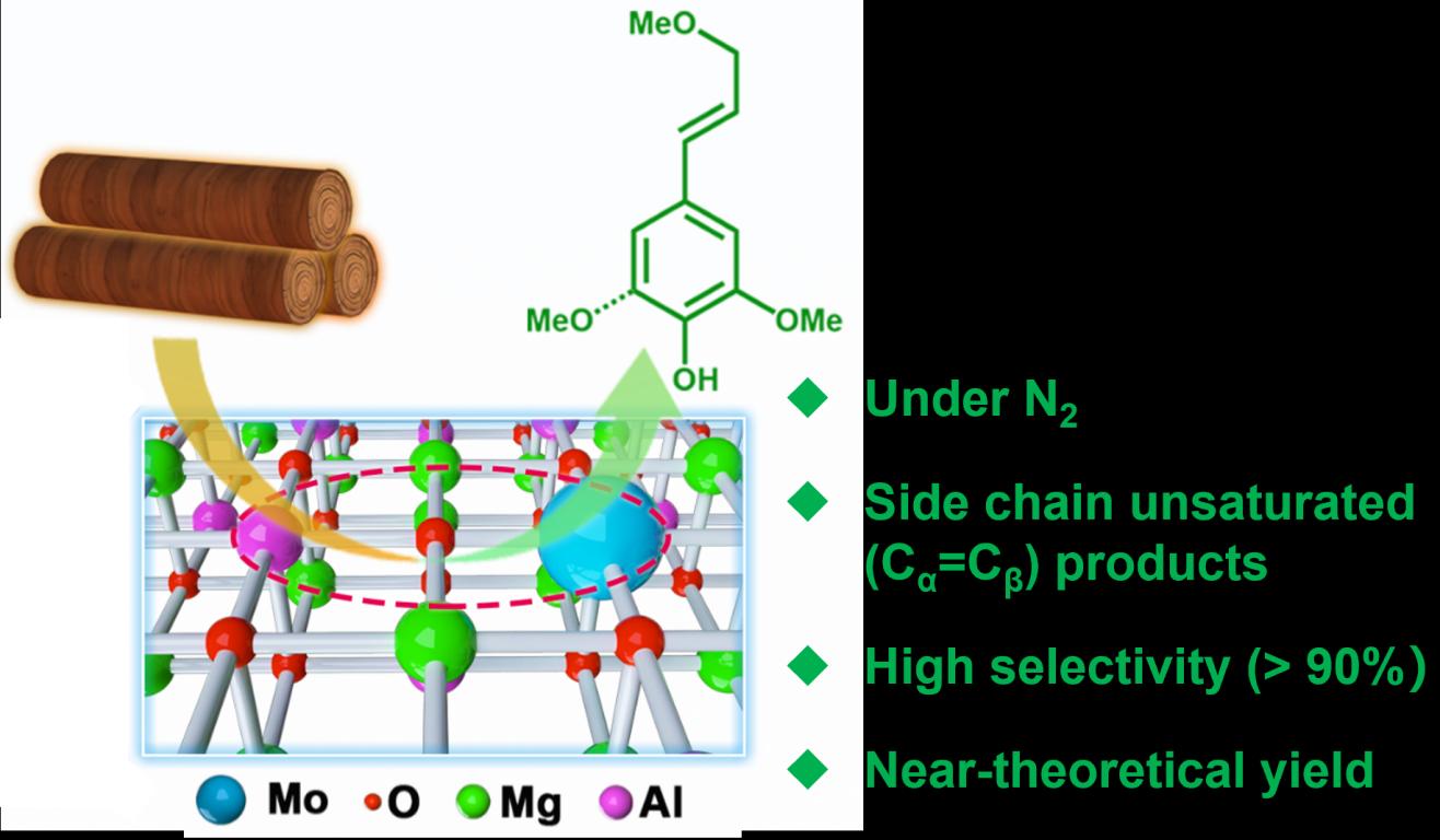 木质素是木质纤维素生物质中含量最高的芳香族聚合物,具有由C-C/C-O键连接的类苯丙基单元,其中芳醚键的比例高达50-85%,因此,通过C-O键裂解进行木质素的解聚引起了人们的较多关注,该方法也为从天然生物质资源中获得高附加值化学品提供了一种有效途径。近几十年来,已经发展出多种不同的催化转化方法来实现木质素的解聚,包括加氢裂解、氧化裂解和非氧化还原裂解。然而,由于木质素结构复杂,且具有多种转化路径,实现C-O(β-O-4)键的高效和高选择性裂解仍然是一个巨大挑战。此外,在众多芳香族单体产物中,具有Cα=Cβ侧链的单体更利于后续的功能化利用,因而更有价值,然而,解聚过程中形成的不饱和C=C键在传统催化剂和高温高压环境下具有较高的加氢、氧化或者缩合活性,从而难以保留。因此,开发一种高效的非贵金属催化剂,在惰性气氛下高效生产侧链不饱和单体仍面临挑战。近年来,单原子催化剂(SACs)由于具有接近100%的金属原子利用率和独特的电子结构,对多种多相反应表现出优异的催化活性。单原子催化的概念也为木质素分解高效催化剂的设计开发提供了巨大的机会。此外,据报道,Lewis酸性位点可以促进木质素解聚效率,然而其催化或助催化机制仍不明确。因此设计一种同时包含单原子金属位点和Lewis酸性位点的多功能催化剂来协同催化木质素解聚以实现高活性和高芳香单体选择性是一种有效策略。