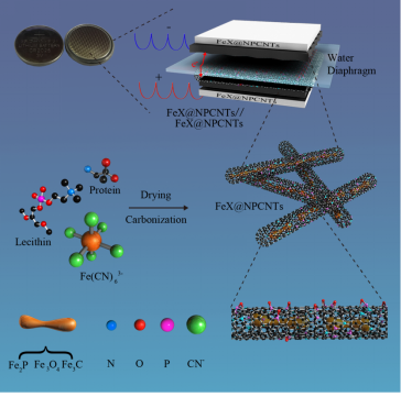 该研究引入了一种简单直接的策略,用于原位合成铁复合纳米颗粒包裹在生物质衍生的N,P共掺杂的碳纳米管中,使用天然资源蛋黄作为富含杂原子的碳源,铁氰化钾作为铁络合物的前体。杂原子掺杂的协同作用和FeX纳米粒子的结合以及独特的结构特征赋予了所制备的样品优异的电容性能,包括高比电容,优异的倍率性能和出色的循环稳定性。基于FeX @ NPCNTs电极组装的对称超级电容器在0.5·A/g的电流密度下显示优异的比电容(体积电容1312.0Fcm-3)。由于外部NPCNT作为保护层,在50000次循环后,容量几乎无损失,并且能使LED灯发光3分钟左右。考虑到实验过程简单和原材料易于获得,这种环保且具有成本效益的策略在探索新型混合材料的超级电容器方面具有很好的价值。