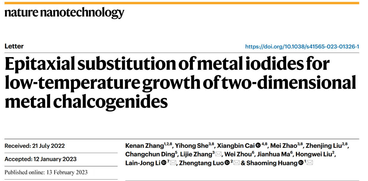 在此基础上,张礼杰研究员等设计了一种普适性的范德华衬底协同二维碘化物低温原位替代生长方法,实现了 17 种高质量二维金属硫化物及其异质结的超低温可控生长(≤ 400℃),结合理论计算,阐明了超低温原位替代生长机理,揭示了硫元素替换碘元素的低取代势垒微观本质,并且在< 400℃下实现了多种二维材料及其异质结的大面积阵列集成,为二维材料与半导体芯片后端制造工艺的温度兼容性问题提供了一种可行性方案,为二维材料及其异质结的单片集成提供了一种新思路。该研究成果以“Epitaxial substitution of metal iodides for low-temperature growth of two-dimensional metal chalcogenides”为题目发表在在Nature 子刊《Nature Nanotechnology》,星空平台为共同通讯单位,我校化材学院张礼杰、香港大学Lain-Jong Li、香港科技大学罗正汤、广东工业大学黄少铭为共同通讯作者,我校化材学院青年教师赵梅为共同第一作者。