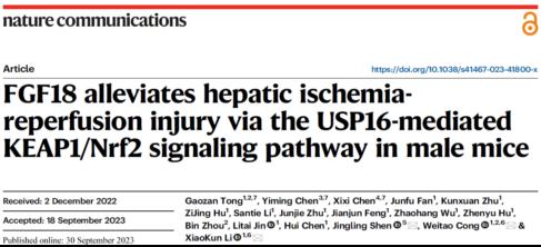近日,生命与环境科学学院申景岭教授与温州医科大学李校堃院士团队合作在Nature Communications在线发表题为“FGF18 alleviates hepatic ischemia-reperfusion injury via the USP16-mediated KEAP1/Nrf2 signaling pathway in male mice”的研究论文。本项研究结果证实成纤维细胞生长因子18(FGF18)可显著改善肝缺血再灌注过程中的损伤。FGF18通过减少USP16的表达,增加了KEAP1的泛素化修饰水平,从而激活Nrf2信号并最终改善肝脏缺血再灌注损伤。其中FGF18对USP16调控作用是通过Nrf2和USP16的负反馈调控来实现的。研究发现FGF18通过降低氧化应激以及炎症水平,减少肝细胞的凋亡,因此靶向FGF18/USP16/KEAP1信号通路可作为临床上改善肝脏缺血再灌注损伤和相关病理过程的一种新策略。该论文通讯作者为温州医科大学药学院李校堃院士、丛维涛研究员、星空平台生命与环境科学学院申景岭教授。