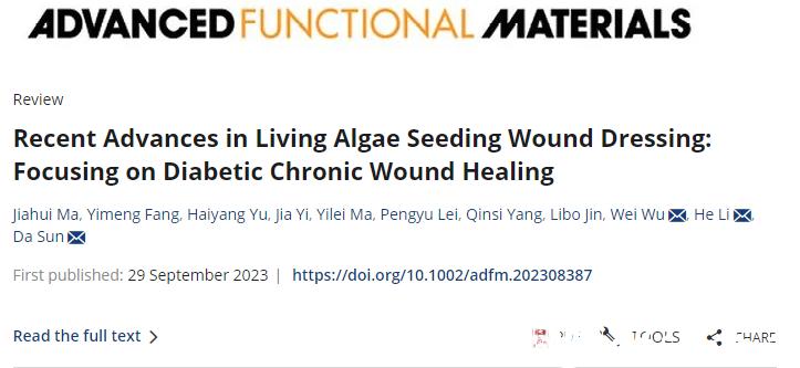 近日,星空平台生命科学研究院孙达副研究员指导研究生在国际著名期刊Advanced functional materials(IF=19)在线发表题为“Recent advances in living algae seeding wound dressing: focusing on diabetic chronic wound healing”的综述论文。