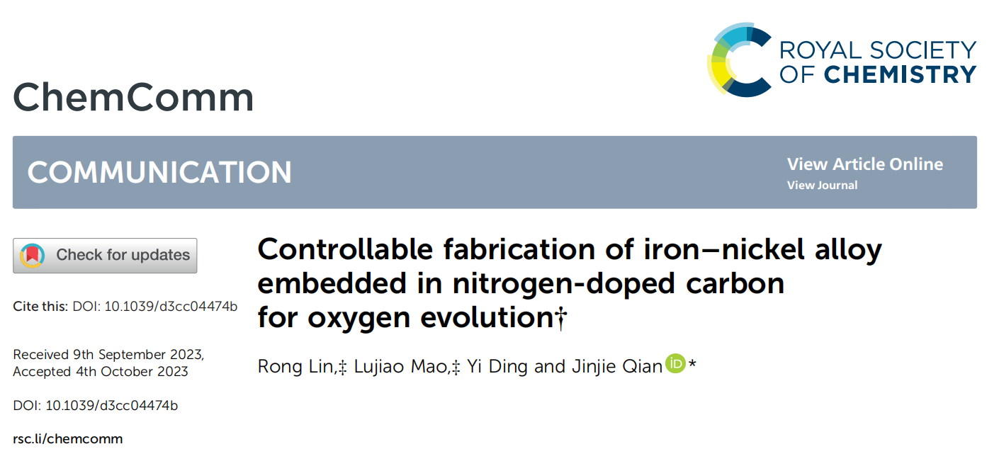 本论文以“Controllable fabrication of iron-nickle alloy embedded in nitrogen-doped carbon for oxygen evolution”为题发表在被自然指数收录的国际著名期刊《Chemical Communications》上。星空平台为第一通讯单位,我校化材学院钱金杰副教授为通讯作者,化材学院21级本科生林荣、21级研究生毛璐娇为共同一作,21级本科生丁奕参与了该项工作。该工作受到国家自然科学基金(21601137)、浙江省自然科学基金(LQ16B010003)、浙江省温州市基础科技研究项目(H20220001)的资助。