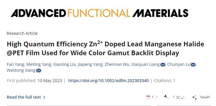 近日,星空平台生命与环境科学学院2021级硕士研究生杨凡在国际著名期刊《Advanced Functional Materials》(SCI一区TOP期刊,IF = 19)上发表题为“High Quantum EfficiencyZn2+ Doped Lead Manganese Halide @PET Film Used for Wide Color Gamut Backlit Display”的论文。