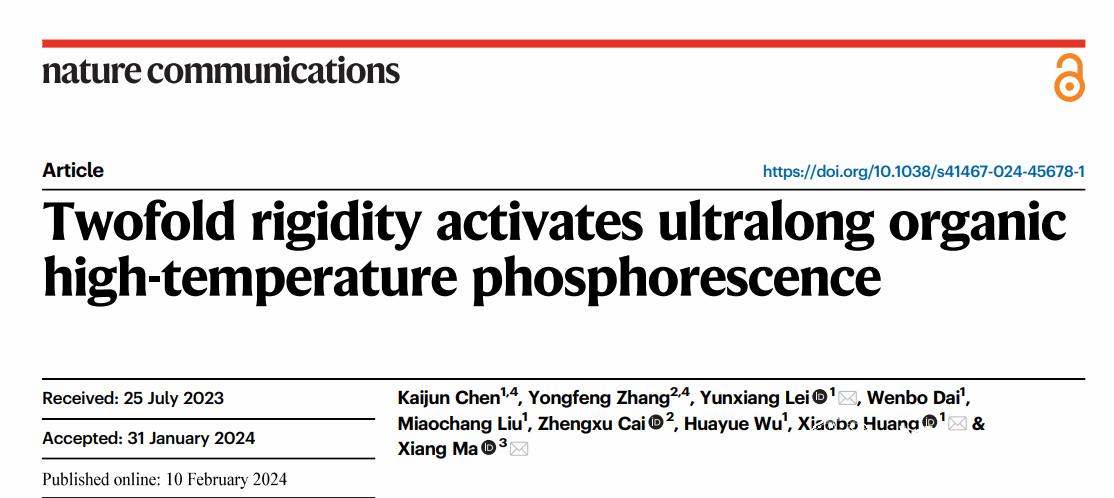 近日我校黄小波教授/雷云祥特聘教授联合华东理工大学马骧教授在国际顶级期刊《Nature communications》上发表题为《Twofold Rigidity Activates Ultralong Organic High-Temperature Phosphorescence 》的学术论文。该工作选择具有几乎完全平面结构的刚性分子9H-二苯并[a,c]咔唑(BCZ)作为客体分子,平面结构可以使分子的振动和旋转最小化。此外,刚性结构有利于增加磷光寿命,延长余辉时间。选择具有刚性结构和高玻璃化转变温度的聚乙烯吡咯烷酮(PVP)作为主体基质,进一步抑制客体的分子运动。这种双重刚性导致掺杂材料BCZ/PVP在293 K下表现出40 s的超长余辉,在373 K下表现出长达20 s的强余辉,在413 K下表现出约6 s的明亮余辉,甚至在433 K下表现出1 s的清晰余辉,表现出优异的HTP性能。此外,将旋转能力从弱到强的甲基、正丁基、苄基、苯基和三苯胺基进一步连接到BCZ分子上,制备了5个对照客体(BCZ-Me、BCZ-nBu、BCZ-Be、BCZ-Ph和BCZ-TPA)。烷基(如甲基或正丁基)对分子激发态能的影响相对较小,因此BCZ-Me/PVP和BCZ-nBu /PVP掺杂材料表现出与BCZ/PVP几乎相同的HTP性能。从BCZ-Be到BCZ-TPA,随着基团旋转能力的增加,相应掺杂材料的HTP性能逐渐下降,符合逻辑和预期的趋势。实验结果和理论计算表明,刚性平面结构可以抵抗高温下的分子热运动。此外,主体基质在高温下提供的刚性环境是影响材料HTP性能的重要因素。进一步选择聚乙烯醇(PVA)和聚己二酰己二胺(PA66)作为主体基质。虽然所有掺杂材料均表现出优异的RTP性能,但由于PVA和PA66的玻璃化转变温度值低于PVP,以PVA或PA66为主体的掺杂材料的HTP性能弱于以PVP为主体的掺杂材料。最后,以其他四种平面分子为客体的掺杂材料也表现出优异的HTP性能,表明双刚性策略具有良好的通用性。本研究提出了构建HTP材料的策略,将促进有机磷光材料的发展。
