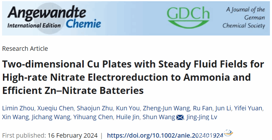 该成果以“Two-dimensional Cu Plates with Steady Fluid Fields for High-rate Nitrate Electroreduction to Ammonia and Efficient Zn–Nitrate Batteries”为题发表在Angewandte Chemie International Edition期刊(IF=16.6,SCI一区)上。星空平台为第一通讯单位,化材学院研究生周李敏、陈雪秋、朱绍均为共同第一作者,我校王正军博士、金辉乐研究员、王舜教授和吕晶晶教授为共同通讯作者。