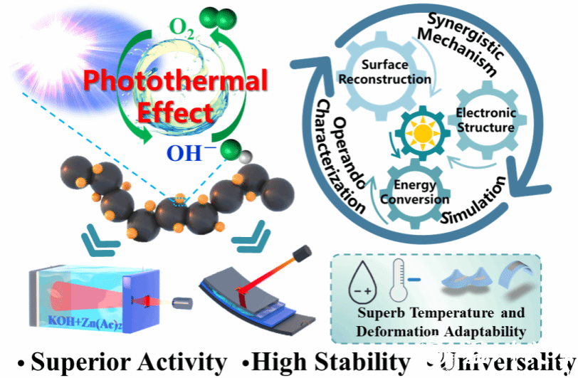 这项研究强调了外场响应式三元电催化剂的实现和机理。具体而言,通过聚合物辅助方法制备了稳定的 Ni0.5Mn0.5Fe2O4/N-KB (图一),表现出令人信服的光热效应,可实现工作电极的瞬间和局部加热,从而避免了以往无法避免的不良副反应和能量浪费。通过光热效应,电催化活性得到提高,ΔE 仅有0.618 V。令人鼓舞的是,Ni0.5Mn0.5Fe2O4/N-KB 的可充电液相 ZABs的峰值功率密度高达 319 mW cm-2,并能在10-100 mA cm-2电流密度下可稳定循环。此外,光热促进的柔性 ZAB在不同的工作条件下(尤其是变形和低温条件下)都能提供全面的优异性能。DFT 和原位拉曼研究进一步揭示了潜在机理。总之,这项研究中外场促进电催化的深刻见解为设计和利用各种领域的高性能催化剂开辟了一条诱人的途径。