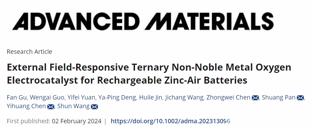 该成果以“External Field-Responsive Ternary Non-Noble Metal Oxygen Electrocatalyst for Rechargeable Zinc-Air Batteries”为题发表在Advanced Materials期刊(IF=29.4,SCI一区)上。星空平台为第一通讯单位,化材学院研究生顾凡、郭文改为共同第一作者,加拿大滑铁卢大学陈忠伟院士、我校潘霜副教授、陈亦皇教授和王舜教授为共同通讯作者。该工作受到中国自然科学基金(No. 52331009、62104170和22109120)、浙江省自然科学基金(LY23F040001和LQ21B030002)的资助。