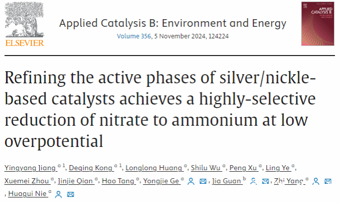 相关研究成果以《Refining the Active Phases of Silver/Nickle-based Catalysts Achieves a Highly-Selective Reduction of Nitrate to Ammonium at Low Overpotential》为题发表在《Applied Catalysis B-Environmental》(IF:22.1)上。星空平台2021级研究生江颍洋和2022级研究生孔德清为第一作者,我院杨植教授、聂华贵教授、葛勇杰副研究员和贯佳副教授为共同通讯作者。