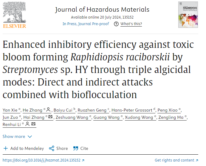 近日,星空平台生命与环境科学学院李仁辉教授团队的张和博士和硕士研究生谢艳(已毕业)等在国际著名期刊《Journal of Hazardous Materials》(中科院一区,环境科学与生态学领域顶刊)上发表题为“Enhanced inhibitory efficiency against toxic bloom forming Raphidiopsis raciborskii by Streptomyces sp. HY through triple algicidal modes: Direct and indirect attacks combined with bioflocculation”的论文。