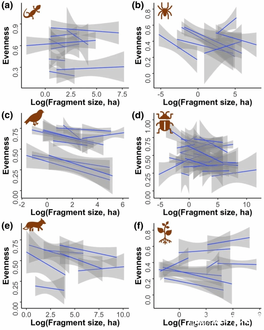 对于不同的分类群而言,昆虫、鸟类、蜘蛛和哺乳动物的物种均匀度与斑块面积之间存在显著的负相关关系,而植物和两栖动物则无此关系(结果详见下图和原文中的表2)。