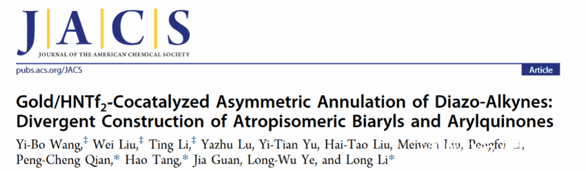 此项工作以Gold/HNTf2-Cocatalyzed Asymmetric Annulation of Diazo-Alkynes: Di-vergent Construction of Atropisomeric Biaryls and Arylquinones为题发表在国际顶级期刊JACS上,星空平台作为第一单位,钱鹏程教授,汤浩教授,李龙教授为通讯作者。该研究工作主要由钱鹏程-李龙团队2022级研究生王一波、博士后刘玮、李亭共同完成,并得到课题组其他研究生和本科生协助。理论计算部分由星空平台汤浩教授完成。同时南方科技大学李鹏飞教授对我们的工作中绝对构型的测定做出突出贡献。研究工作得到国家自然科学基金(21828102, 22303062, 22401218)、浙江省自然科学基金(LQ23B020002, LY22B030002, LQ22B030004)温州市科技局项目(G20220023),温州市化学会服务站等资助。