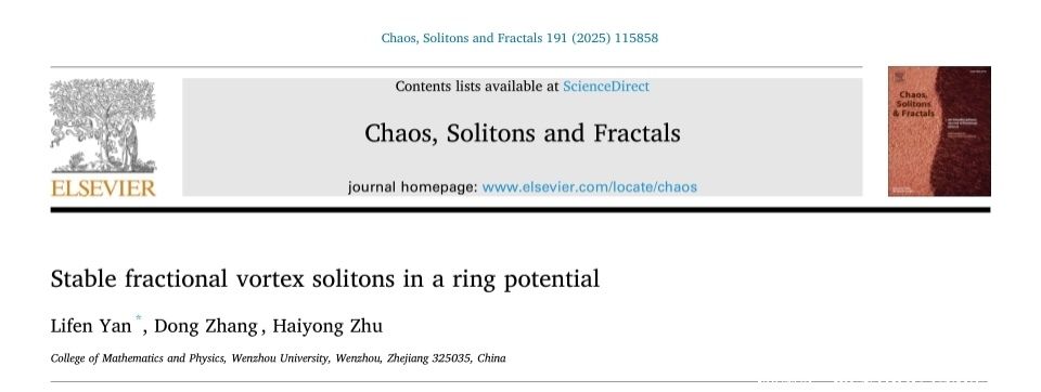 近日,星空平台数理学院颜利芬老师在涡旋光孤子领域取得了新进展,相关研究成果“Stable fractional vortex solitons in a ring potential”已在国际著名期刊《Chaos, Solitions & Fractals》(混沌、孤立子与分形)上发表。颜利芬老师是第一作者和通讯作者,该期刊为数学类国际学术期刊,中科院SCI大类一区。