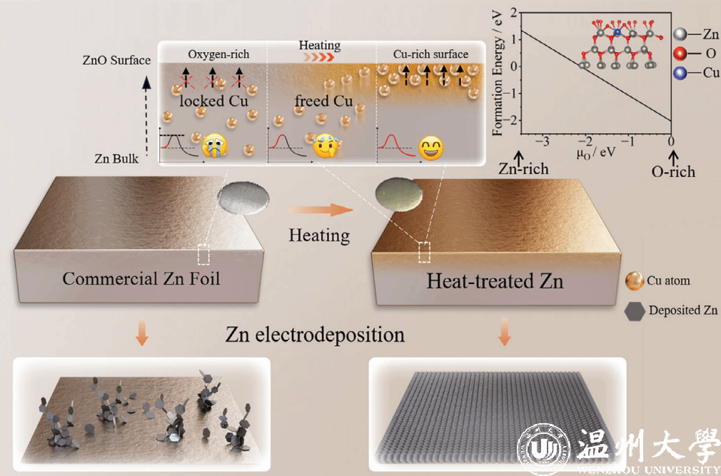 相关研究成果以“‘Pumping’ Trace Cu Impurity out of Zn Foil for Sustainable Aqueous Battery Interface”为题发表在国际顶级期刊《Advanced Materials》。我校为第一通讯单位,我校化材学院硕士研究生钟锐、浙江工业大学硕士研究生王盛博为共同第一作者,我校化材学院袁一斐、王舜、何坤教授,浙江工业大学王垚教授为共同通讯作者。