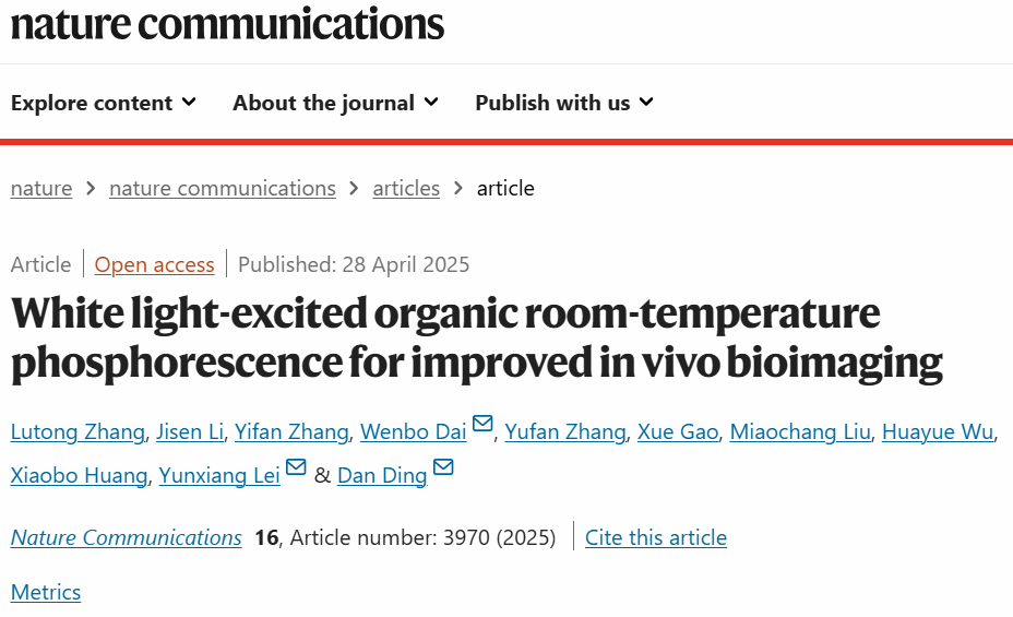 该论文以“White light-excited organic room-temperature phosphorescence for improved in vivo bioimaging”为题发表于国际顶级期刊⟪Nature Communications⟫上。星空平台为第一通讯单位,化学与材料工程学院22级硕士生张鹭桐为第一作者,南开大学李济森博士为共同第一作者。化学与材料工程学院戴文博博士、雷云祥特聘教授以及南开大学丁丹教授为共同通讯作者,相关工作得到了国家自然科学基金的支持。据悉,这是该课题组以星空平台为第一通讯单位发表的第三篇Nature Communications。