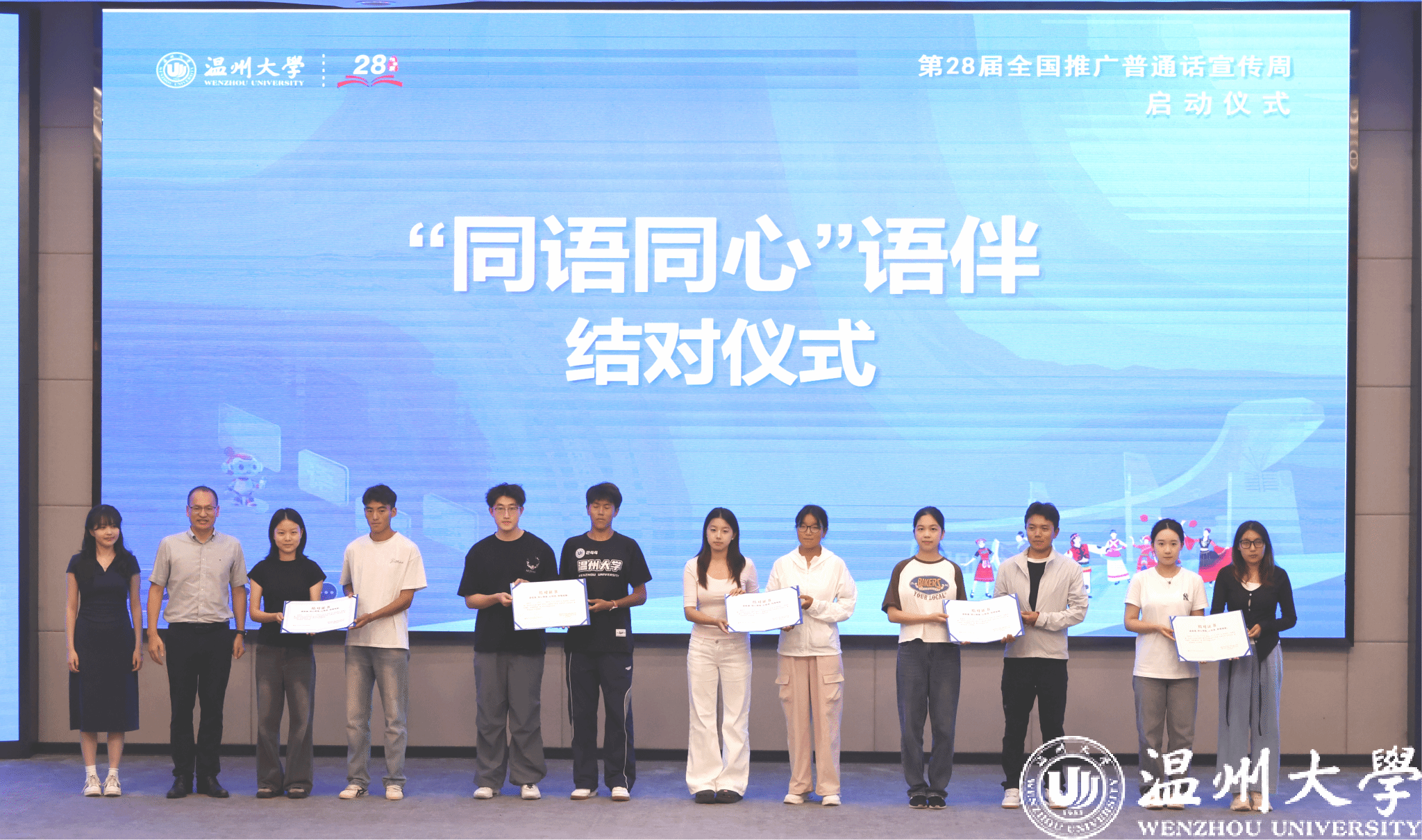 现场举行了“同语同心”语伴结对活动,10位少数民族同学和汉族同学结对学习、提高普通话水平。吴永远为同学们颁发证书,勉励同学们学好普通话,加强沟通交流、凝聚民族情谊。学生代表余佳豪宣读了推广普通话倡议书,号召全校师生积极推广国家通用语言文字,以实际行动促进校园文明建设。