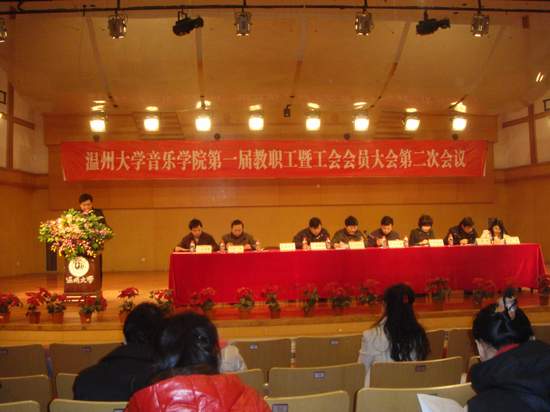 副院长(主持工作)李杰鹏在会上做了题为《凝心聚力创和谐,务实进取谋发展》的学院工作报告,报告在对2007年以来学院的成绩进行回顾总结的同时,提出了今后三年学院的发展思路。学院工会主席刘玉亭老师在会上作了学院工会工作报告。副院长王文韬对《音乐学院津贴分配办法(草案)》作了说明。随后各代表团以分组讨论的形式,讨论审议了《学院工作报告》、《《学院工会工作报告》和《音乐学院津贴分配办法(草案)》。会议表决通过了《学院工作报告》、《学院工会工作报告》和《音乐学院津贴分配办法(草案)》。最后学院党总支书记刘青松致闭幕词,宣布大会圆满闭幕。