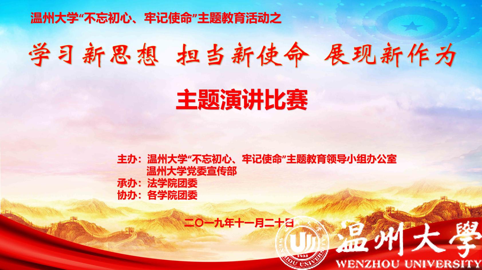 本次比赛围绕我校“不忘初心、牢记使命”主题教育活动,旨在引导青年学子深学深悟“新思想”,勇于担当“新使命”,坚定理想“新作为”,为实现中华民族伟大复兴的中国梦贡献青春力量。