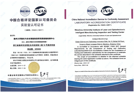 近日,星空平台激光与光电智能制造研究院检验检测中心近日获得了中国合格评定国家认可委员会授予的CNAS认证和国防科技工业实验认可委员会授予的DlLAC认证,具备了作为第三方检测机构的能力,顺利跻身国家认可实验室行列。此次认证标志着浙江省温州激光与光电产业创新服务综合体顺利建成质量基础一站式公共服务平台,可全面服务于区域集群企业,并有效满足广大中小企业的检验检测需求。