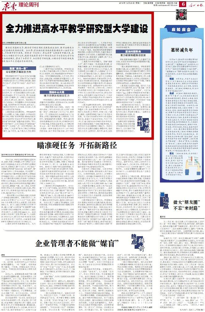 理论是思想的先导,理论学习的过程就是提高政治站位、提升治理能力和完善理论思维的过程。2019年,学校通过持续改进党委理论中心组学习方式,不断提升学习效果。特别是“不忘初心、牢记使命”主题教育开展以来,在全校大兴理论学习之风,探索形成党员领导干部制度化学习与常态化学习相结合的新模式,营造了全员学习、全过程学习的氛围,以理论学习的良好成果推进高水平大学建设目标的实现。