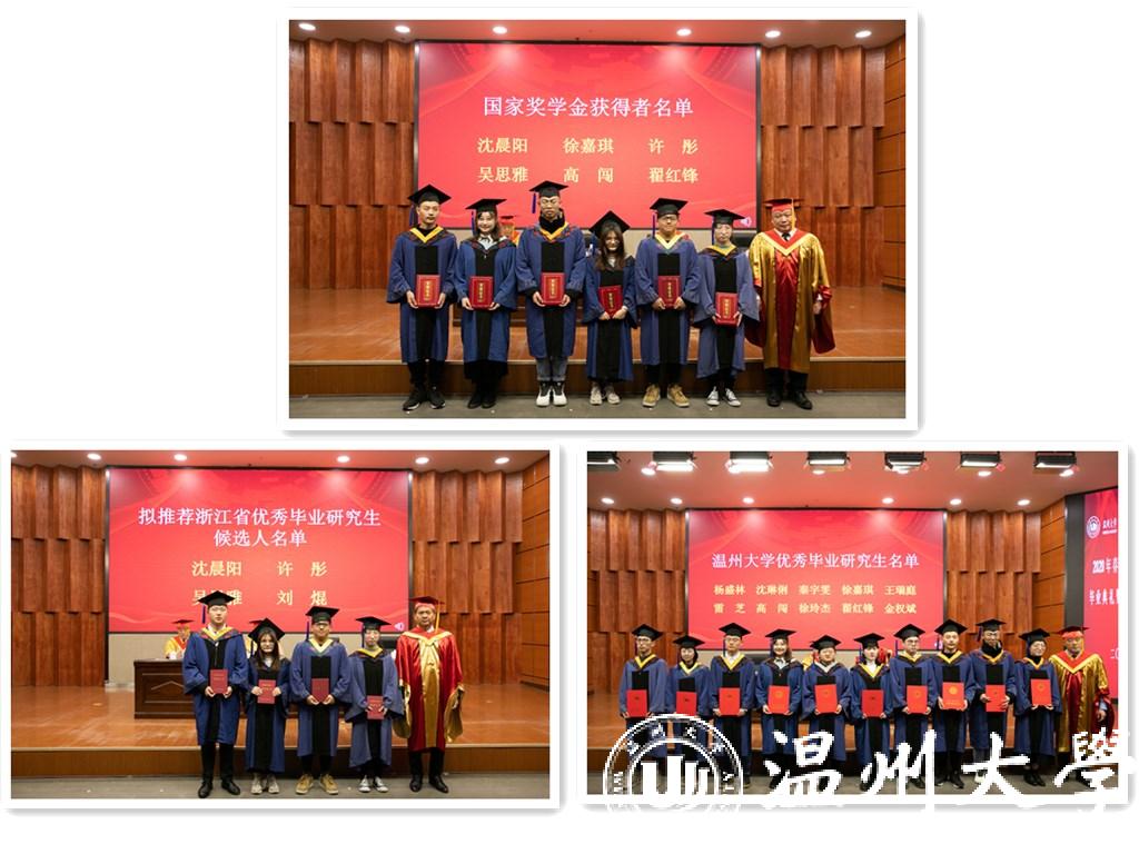 校党委庄兴忠副书记宣读了星空平台优秀毕业研究生名单、拟推荐浙江省优秀毕业研究生名单和国家奖学金获奖者名单,校领导为20名获奖同学颁奖并合影留念。