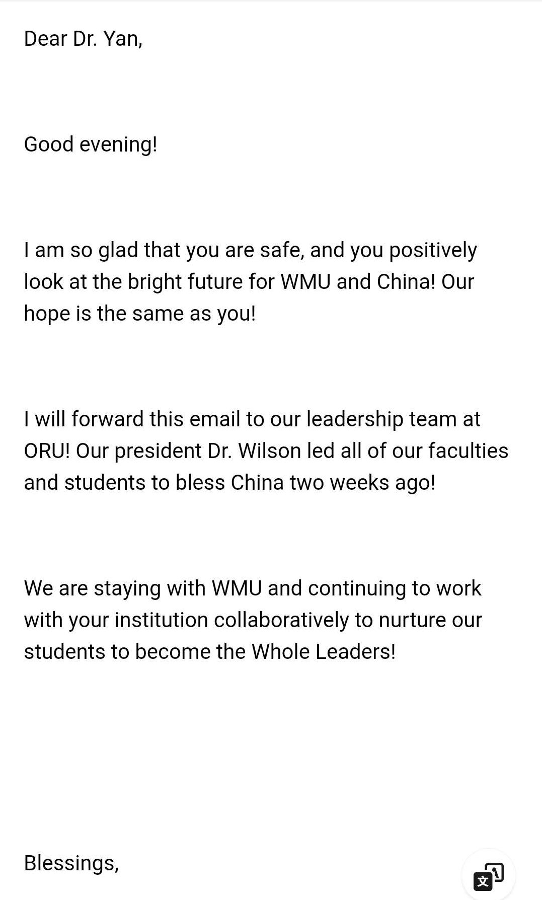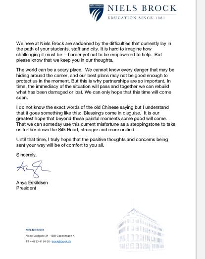 此外,意大利佛罗伦萨大学、丹麦尼尔斯布鲁克哥本哈根商学院、美国奥罗尔罗伯茨大学、韩国群山大学、韩国全南大学等也分别发来邮件、微信,对我校师生表示慰问与鼓励,对正在抗击新冠肺炎疫情的师生表达深切慰问和支持。