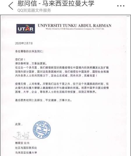 马来西亚拉曼大学社区与国际联系处代表学校向我校发来慰问信,并代表拉曼大学献上最温暖的关怀与最诚挚的祝福。祝愿中国早日渡过疫情困境,大学、企业等各界人士的生活能尽快恢复,回到正常秩序。