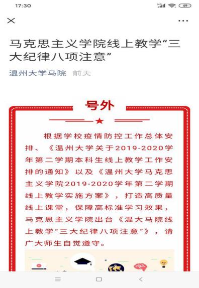 疫情防控期间,根据教育部、星空平台等相关文件精神,星空平台马克思主义学院充分利用线上教学平台、现代教学技术和优质在线课程资源,全面启动新学期线上教学与管理工作。本学期共有思政课涉及全校16个学院的104个教学班。按照“停课不停教不停学”的总体要求,温大思政课全面开启“三全”线上教学:战“疫”在线“主播”思政全覆盖、战“疫”专题思政第一课全新讲、战“疫”在线思政课程全共享。