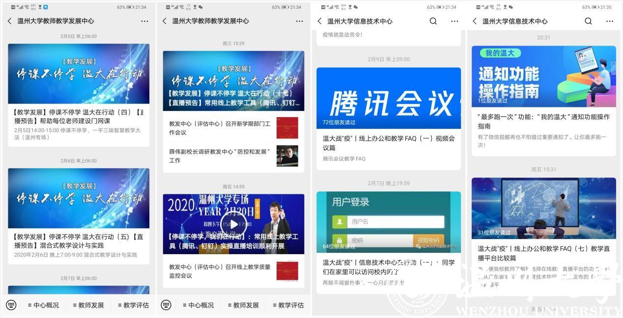 技术支持,远程协助教学无忧。信息技术中协调各方资源快速开通学生webvpn服务,第一时间给所有本科生开放账号,保障学生在家无障碍访问图书馆、教务系统等校内资源,并为商学院、计算机学院设置特殊通道,使学生可以在家访问实验室资源与进行远程实验。中心还第一时间对比测试各种线上教学平台和工具,选取其中稳定易用的种类,推荐给老师们,并一一说明其优缺点;提供服务热线手把手教老师们建课与使用,发布系列建课和学习操作指南微信推文提供指导;同时每天收集使用过程中碰到的问题,形成FAQ文档,及时反馈给老师,以帮助学生与老师更好的沟通,开展线上学习。