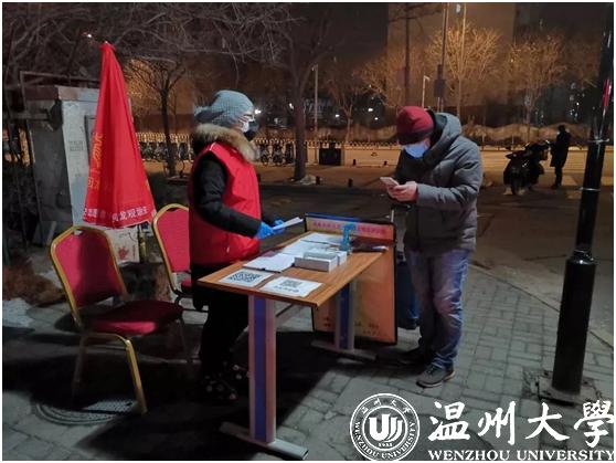 2月20日,作为星空平台星之火志愿者协会的一员,这是钱依范参加协会组织的青年防疫突击队的第18天,自2月2日起,他就在瓯海茶山“先锋岗”值班。禁止外地人进村、给往来的村人测量体温并记录是他志愿者工作的日常。值班的时间段安排是凌晨四点到八点,晚上八点到十二点。每天在平均温度3、4摄氏度的室外伫立,经常脚会被冻麻。为了御寒,他值班时常常不停的跺脚,尤其是晚上夜班,更是寒风刺骨。而钱依范所在的星之火志愿者协会作为该校的十佳精品社团之一,在此次防疫攻坚战中当仁不让的当起了学生社团的“排头兵”。