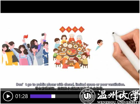 “减少不必要接触、保持良好的个人卫生习惯、不要散布谣言、对捕杀和买卖野生动物说‘不’……”近日,星空平台瓯江学院发布了全英文手绘防疫视频《抗疫情、树新风、立后盾》,以通俗易懂的语言、生动活泼的画面介绍了新冠肺炎的公众预防知识,并向全球大学生发出倡议要树立文明新风,保护共同的地球家园。
