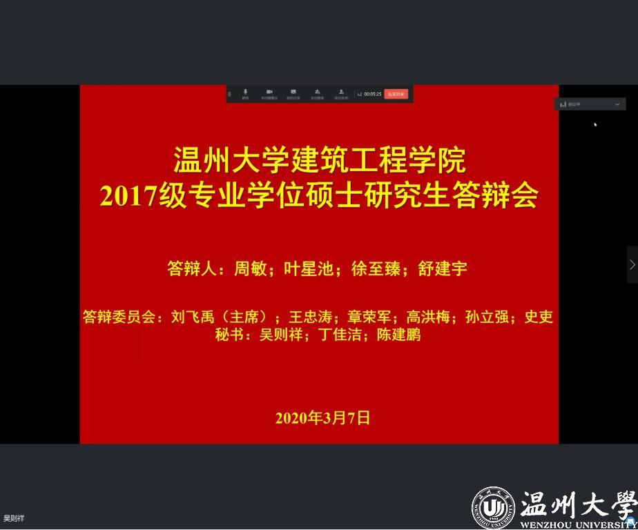 根据当前疫情防控正值关键时期,我校秉承“以生为本、优化流程、分批推进、确保质量”的原则,在保证学位授予质量的前提下,精心组织、周密部署,我校春季研究生学位论文网上答辩开始启动。3月7日,建筑工程学院首批21名建筑与土木工程专业领域硕士研究生学位论文线上答辩圆满完成!