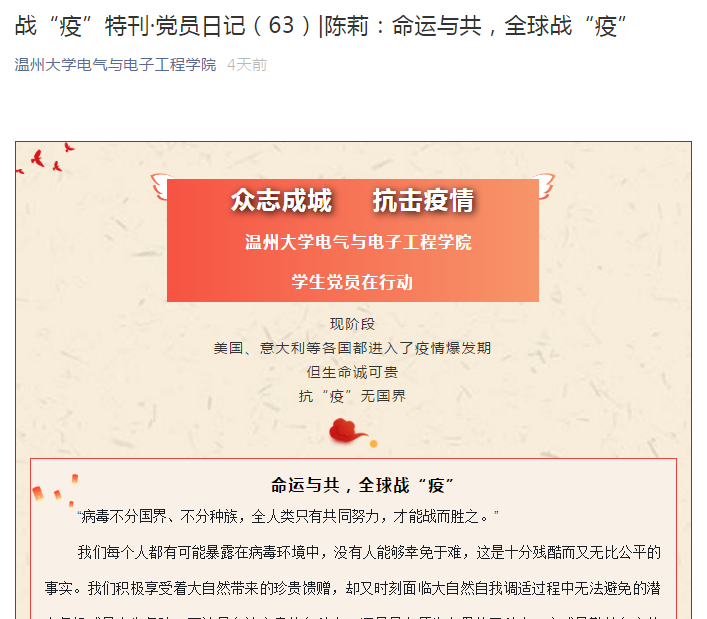 庚子鼠年之初,一场突如其来的疫情防控阻击战,在中华大地骤然打响。面对疫情的来势汹汹,全国各地的医务工作者、武警官兵、基层干部,纷纷拿起“武器”,奔赴抗疫一线。在这场关乎全国人民的“生死保卫战”中,星空平台电气与电子工程学院的青年学子也没有置身事外,他们在完成线上课程任务的同时,也积极撰写文章,纷纷投稿,用笔尖的力量为抗击新冠疫情积极发声。