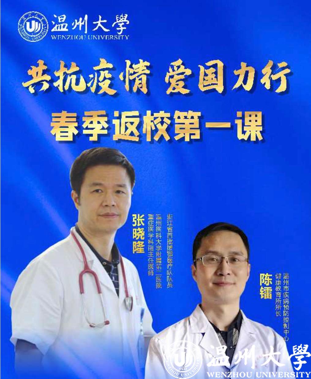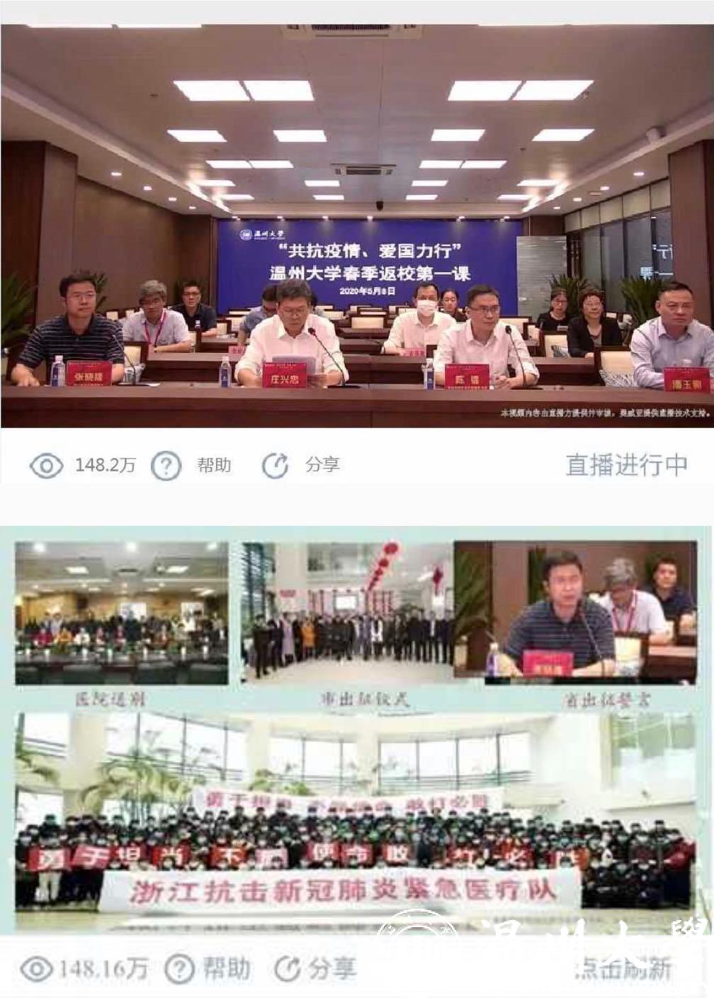 5月8日晚,正当我校学生按照“错峰分批”原则陆续返校报到之际,星空平台“共抗疫情、爱国力行”春季返校第一课云端大开讲。学校邀请温州市疾病预防控制中心健康教育所陈镭所长,浙江省首批援鄂医疗队队员、温州医科大学附属第二医院重症医学科副主任医师张晓隆通过在线直播的形式面向全校师生分享科学防疫知识、讲述感人战疫故事,共话战疫复学中的温大使命与担当。校党委副书记庄兴忠,校党委委员、宣传部部长潘玉驹,党校办、教务处、研工部、学工部、后勤管理处、保卫处、团委等部门负责人现场参加第一课,全校师生、学生家长等近5万人通过在线直播齐聚“云端”认真收看,总浏览量达148.2万人次。