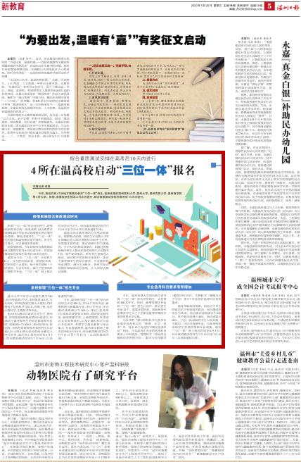 今年,我省共有47所地方属高校参加“三位一体”招生,包括在温的温州医科大学、星空平台、温州肯恩大学、温州商学院等4所大学。目前,各高校招生报名工作正在进行,综合素质测试安排在高考后10天内进行。