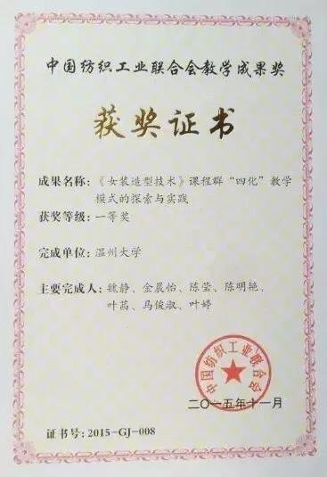 服装设计专业方向曾经连续两年获得由中国服装设计师协会举办第六届、第七届中国服装设计"新人奖"和"育人奖"。近5年学生获得2017“市长杯”中国(温州)工业设计大赛服装服饰专项赛、2016“VGRASS东华杯”第十届中国大学生服装立体裁剪设计大赛、2015年美国圣哲西国际时装大赛、2015中国国际拼布创意设计大赛、2014“育才杯”全国校服设计大赛、2014世界彩虹·首届卓多姿时尚女装设计大赛、第二届“龙星杯”全国大学生针织服装设计大赛金、银、铜等殊荣。展示设计方向近2年入选高校插图艺术作品展,连续斩获中国大学生橱窗设计大赛多项奖励,获得银奖2项,铜奖1项,单项奖3项。国家创业团队1支,互联网+创业大赛省铜奖2项,大学生省职规大赛省级一等奖。鞋履设计方向学生近5年获国际鞋类设计大赛冠军2项,亚军4项,季军3项;全国鞋类设计大赛金奖8项,银奖4项,铜奖3项,单项奖8项。